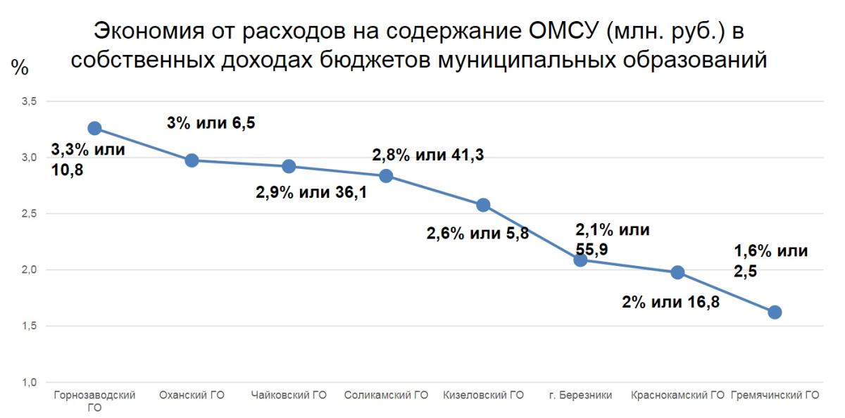 Александр Борисов сообщил, что после объединения муниципалитетов в каждом городском округе снизились расходы, связанные с содержанием органов муниципального самоуправления. Больше всего удалось сэкономить в Березниках (55,9 млн руб.), а также в Соликамском (41,3 млн руб.) и Чайковском городских округах (36,1 млн руб.). «Но если смотреть на расходы на содержание органов муниципального самоуправления в разрезе собственных доходов бюджетов муниципальных образований, то здесь в лидерах Горнозаводский городской округ. Экономия там составила 3,3%», — пояснил министр, однако добавил, что в будущем эти цифры, возможно, будут меняться. Всего же ожидаемое сокращение расходов на содержание органов МСУ благодаря реализации реформы, по его словам, составит 326 млн руб. Такую же сумму край предоставит объединившимся территориям на реализацию инвестиционных программ.
