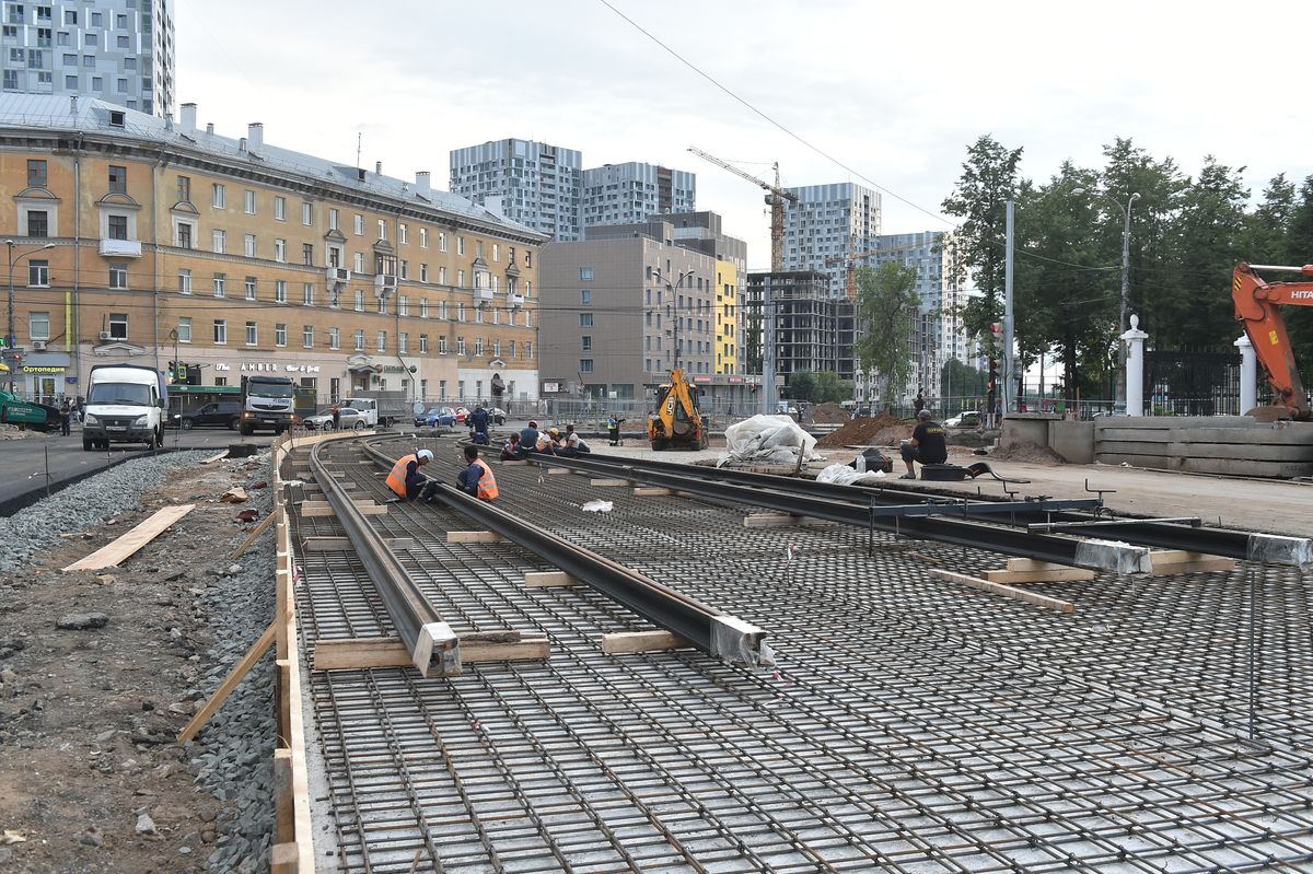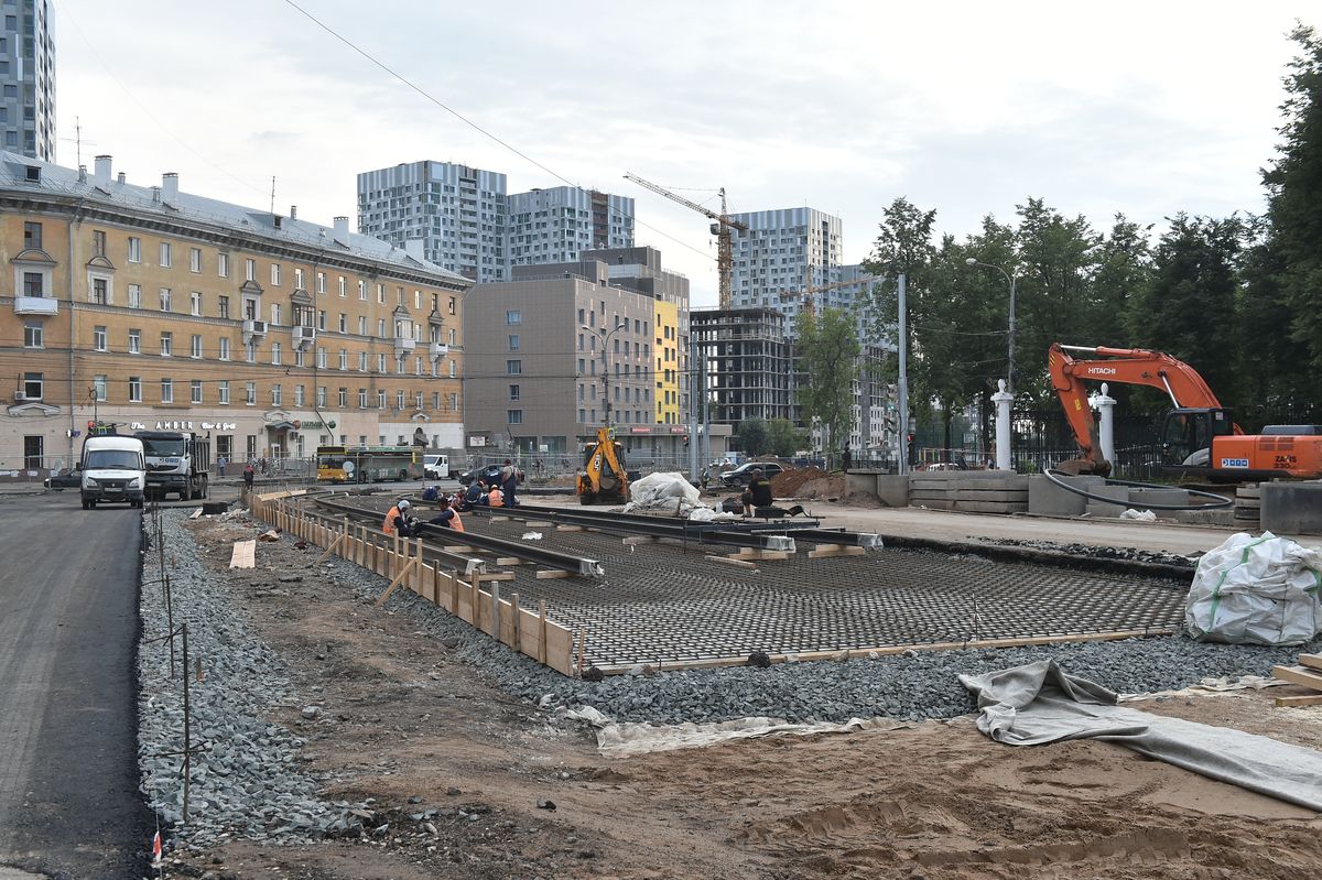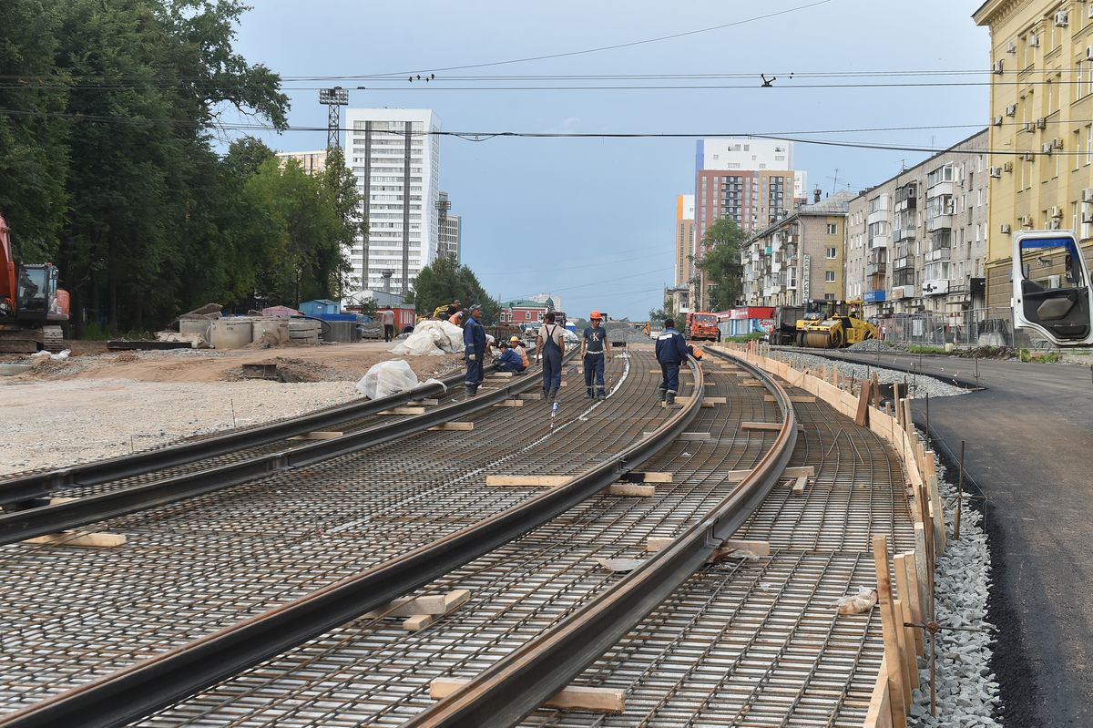 Работы по укладке рельсов должны завершиться в начале августа. Затем строители переместятся на участок от ул. Куйбышева до Комсомольского пр.