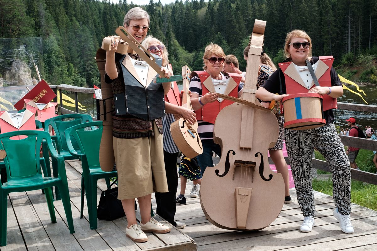Первый фестивальный день запомнился лекционной программой для промышленных дизайнеров и мейкеров. Те, кто приехал в Хохловку без образовательной цели, лежали на траве под звуки пермских бендов 3000К и OQJAV. Другие, снарядившись в картонные доспехи, принимали участие в параде уличного театра «Картония».