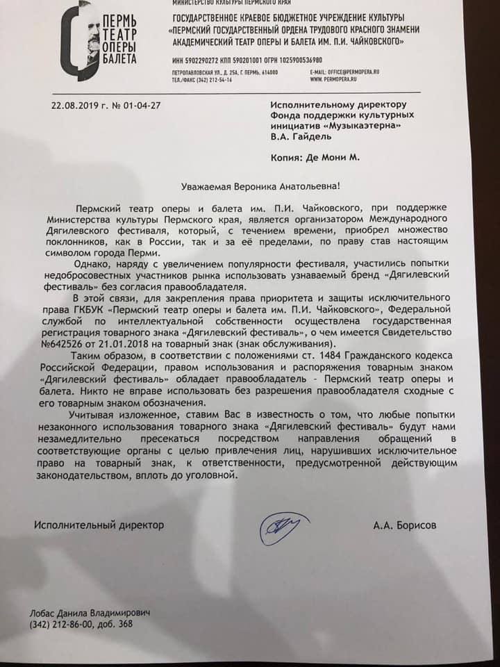 Пермский театр оперы и балета готов преследовать «любые попытки незаконного использования товарного знака «Дягилевский фестиваль». Об этом театр сообщает в письме на имя исполнительного директора Фонда поддержки культурных инициатив «Музыкаэтерна» Вероники Гайдель и менеджера Марка де Мони. Письмо на своей странице Facebook разместил пермский медиаменеджер Владимир Прохоров.