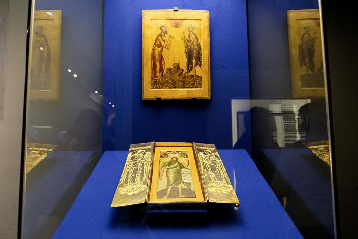 Так, среди «Шедевров кремлёвских мастерских» — работа прославленного московского иконописца Симона Ушакова, который руководил Оружейной палатой в 1670-е годы. На доске — изображение Фёдора Стратилата, который был святым патроном царя Фёдора Алексеевича. Икона была написана в 1676 году, в год его восшествия на престол, для Баговещенского собора и находилась в иконостасе напротив царского моленного места.