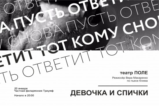 Частная филармония «Триумф» и «ПОЛЕ-театр» представляют спектакль по пьесе Владимира Клименко (KLIM) «Девочка и спички» (6+). Это камерный спектакль-исследование для 70 зрителей с элементами иммерсивности. Режиссёр и актриса спектакля Вера Макаренко, выпускница ГИТИСа, мастерской Марата Гацалова.