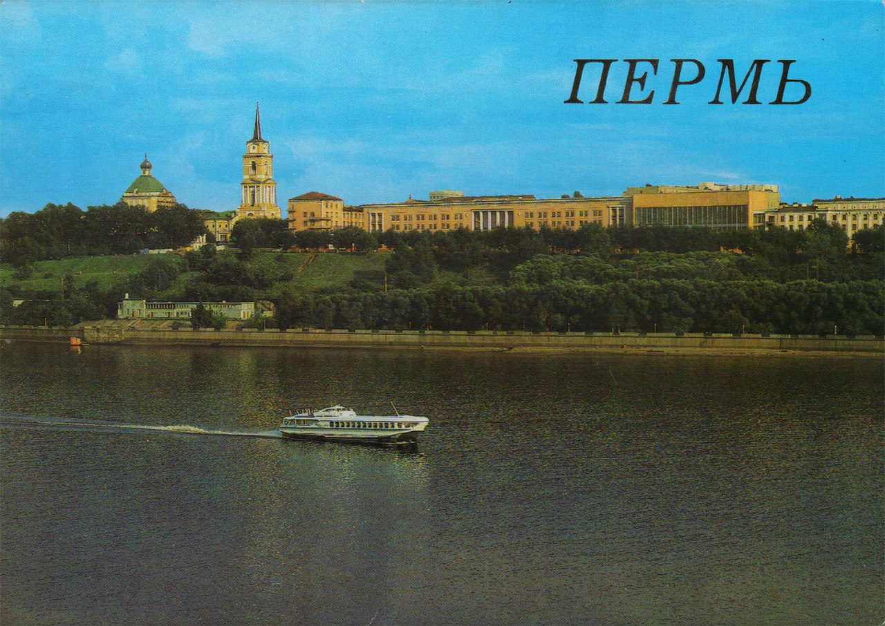 Речной пассажирский теплоход на подводных крыльях. Комплект открыток "Пермь". Фото Е. Гаврилова. Издательство "Плакат". Москва, 1988 г.