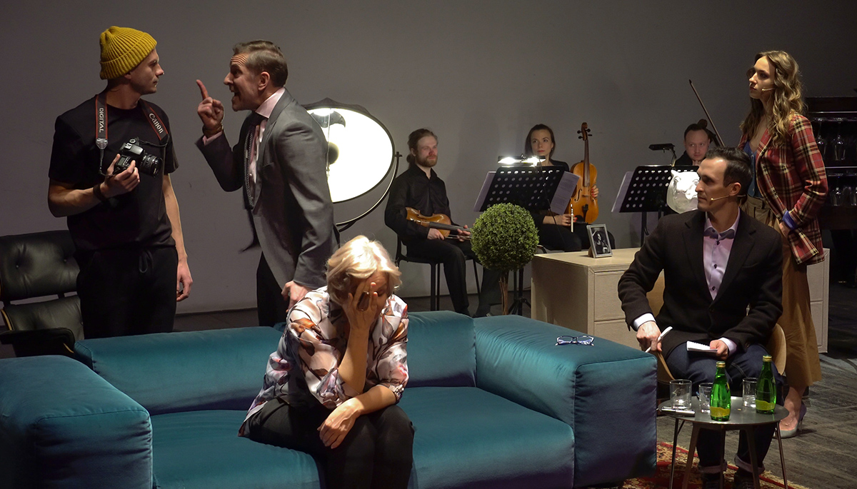 Роли играются ровно столько, сколько длится реплика. Говорит реплику Улья Рихте (Елена Старостина) — все остальные сидят и молчат. Реплика переходит к Стиву Ракуну (Вячеслав Чуистов) — замирают все прочие. Когда интервью превращается в полное безобразие, а Кшиштоф Зелинский (Алексей Каракулов) и его собеседница нарушают все установленные границы, Стив Ракун и Натали Блуменштайн (Екатерина Вожакова) — охранники этих границ — должны, по идее, активно пытаться это безобразие прекратить, но каждую возмутительную реплику писательницы они терпеливо, неподвижно и бесчувственно выслушивают, и лишь дав Улье договорить и поставить увесистую интонационную точку, пытаются протестовать. Опять, как и в «Иранской конференции», возникает ощущение, что это — костюмированная читка, а не спектакль.