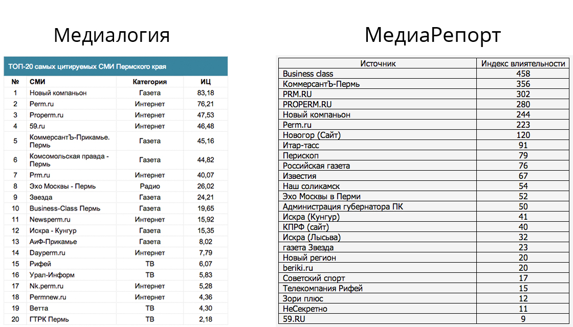 — Причина — разница подходов. «Медиалогия» рассчитывает индекс цитируемости, исходя из трёх параметров: 1) стоимость рекламной полосы; 2) исходя из этой стоимости, издания делятся на три группы; и вот только третий пункт — это количество упоминаний. У «Медиалогии» по Пермскому краю 70 источников, у нас — 212. Они смотрят с точки зрения Москвы, то есть подход «Медиалогии» для тех, кто знаком с методикой. Мы же рассчитывали только по количеству упоминаний. Наша компания зарегистрирована в 2006 году в Москве, а основная производственная база находится в Перми, мы — пермские.