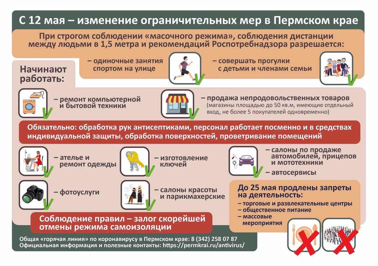 Также в Пермском крае с 12 мая разрешены одиночные занятия спортом, прогулки с детьми и членами семьи. Совершать это нужно в маске и перчатках при дистанции в 1,5 м.