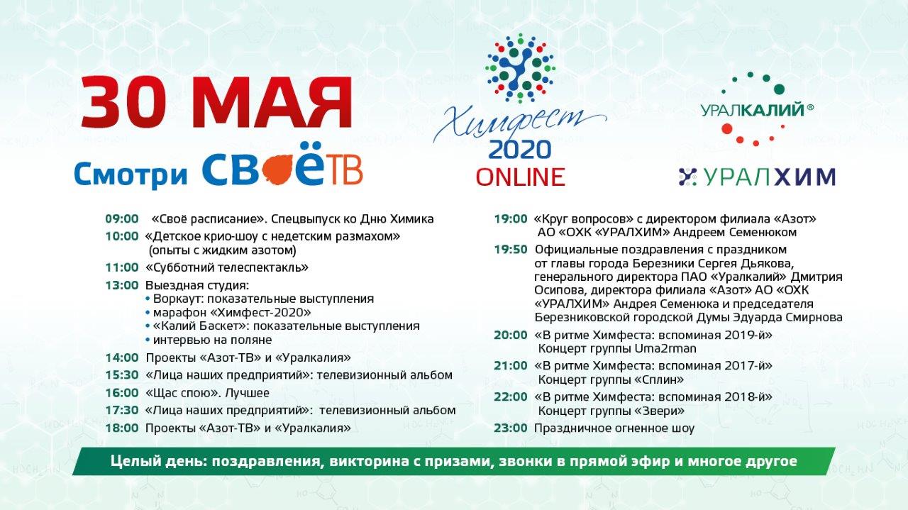 Традиционный восьмой фестиваль «ХИМФЕСТ» пройдёт в онлайн-формате 30 мая. В этом азотчикам поможет телекомпания «Своё ТВ» (г. Березники). Трансляцию все желающие смогут увидеть в эфире телеканала «Своё ТВ», на официальном сайте химфест.рф, в пабликах «ВКонтакте»: «Азот-ТВ», Березниковская независимая газета «Неделя.ру», «Свое ТВ».