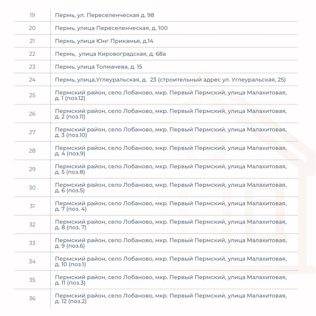 Фонд и краевое правительство уже начали совместную работу на трёх проблемных ЖСК: «Толмачёва, д. 15» (один дом), «Первый Пермский микрорайон» (12 домов), «Екатерининская, д. 175» (три дома). Фонд на данных объектах инициировал все предусмотренные законом процедуры: инструментальное обследование домов, техническая экспертиза, оценка стоимости квадратного метра.