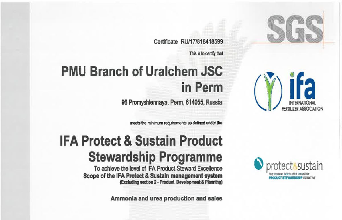 В 2017 году филиал «ПМУ» АО «ОХК «УРАЛХИМ» в г. Перми стал первым промышленным предприятием в России, сертифицированным по программе Protect & Sustain. Эта программа была разработана самими членами Международной ассоциации производителей удобрений с приглашёнными аудиторами специально для участников общества. IFA признаёт, что компании, сертифицированные по программе Protect & Sustain, демонстрируют свою приверженность обеспечению того, чтобы удобрения использовались только на благо, и что риски, связанные с этими продуктами, были сведены к минимуму и, где это возможно, устранены. В мире по этому стандарту сертифицированы крупнейшие производители удобрений: Yara, Agrium, Prayon, PotashCorp и другие.