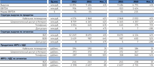 За 12 месяцев 2012 года выручка от услуги широкополосного доступа в Интернет составила 8 759 млн. руб. без НДС (63% в общей структуре выручки), от предоставления услуг кабельного телевидения — 4 076 млн. руб. без НДС (29% в структуре общей выручки), от предоставления услуги телефонии — 1 054 млн. руб. без НДС (8 % в структуре общей выручки).