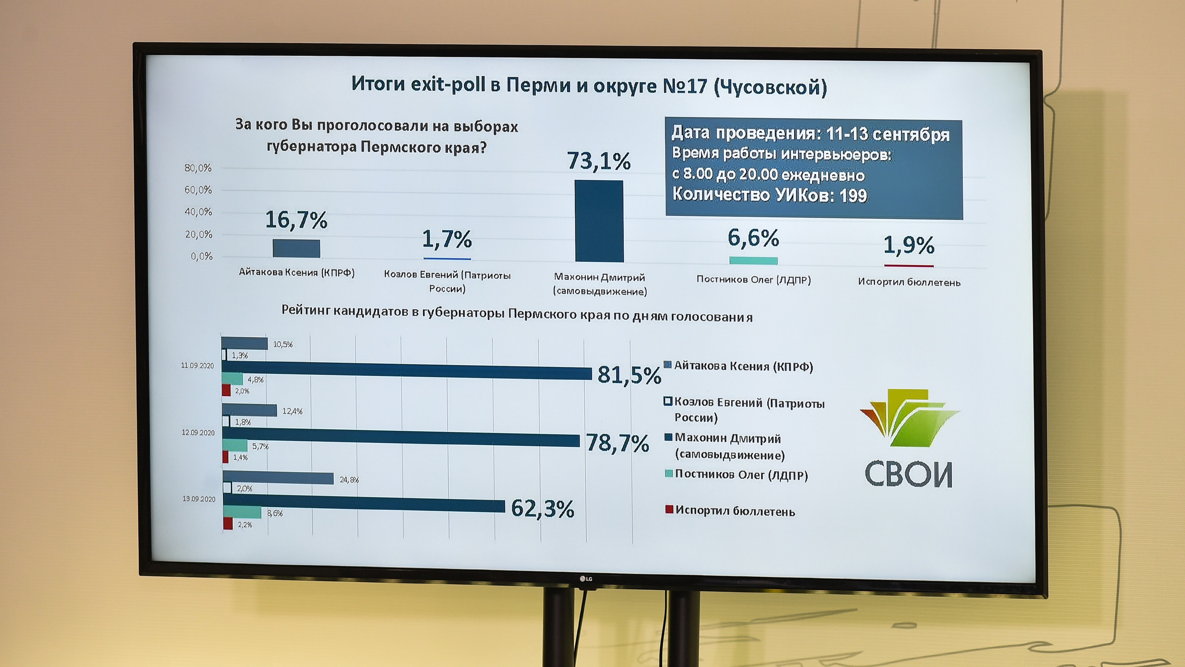 Во время включения федеральной «Ночи выборов» кандидаты повторили то же самое про уважение друг к другу в ходе кампании и после, Ксения Айтакова похвалила сама себя («программа пользовалась популярностью»), Олег Постников заверил, что обратной дороги нет, а Дмитрий Махонин сказал про про высокий уровень уважения к коллегам.
