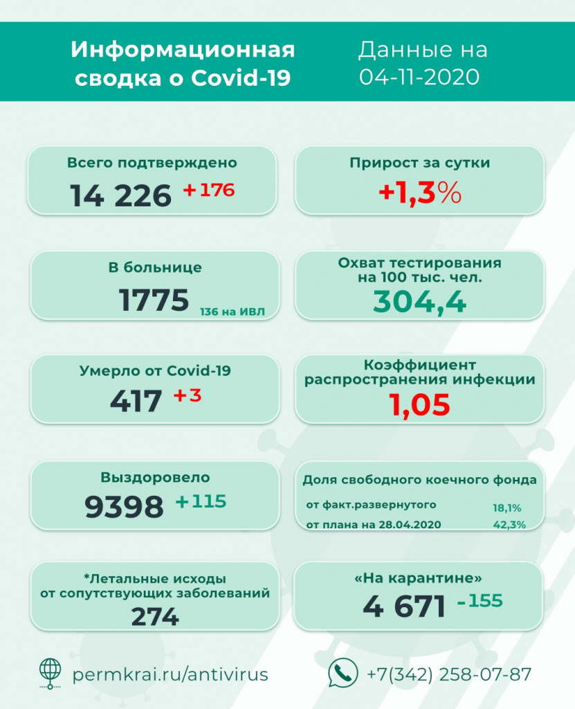 Таким образом, общее количество инфицированных в Прикамье за всё время достигло 14 226 человек. Из них 9398 выздоровели, 691 скончались (417 — напрямую от вируса, 274 — от сопутствующих заболеваний).