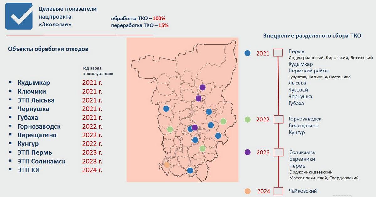 Предполагается, что в 2022 году на раздельный сбор перейдут Горнозаводск, Верещагино, Кунгур. В 2023-м — Березники, Соликамск и оставшиеся три района Перми (Мотовилихинский, Орджоникидзевский, Свердловский). В 2024 году в проект включится Чайковский.