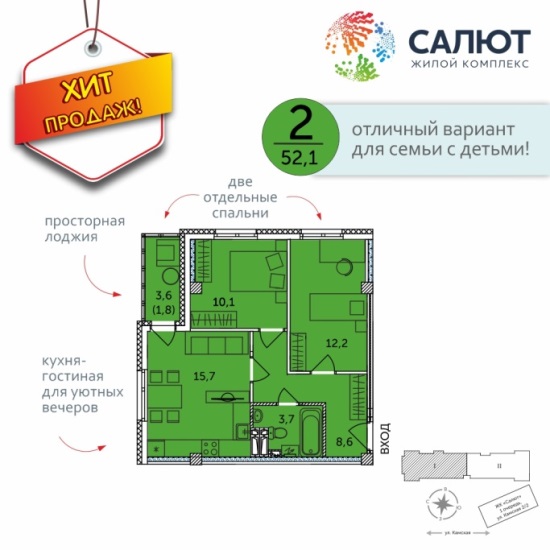 В ЖК «Салют», 2 дом1 активно реализовываются квартиры с участием «сельской ипотеки». Кредит предоставляется на срок до 25 лет по ставке от 2,7% годовых. Максимальная сумма займа — 3 млн руб. Минимальный первоначальный взнос по кредиту — 15% от стоимости жилья. Важно, что с октября 2020 года в оплату первоначального взноса можно использовать средства материнского капитала.