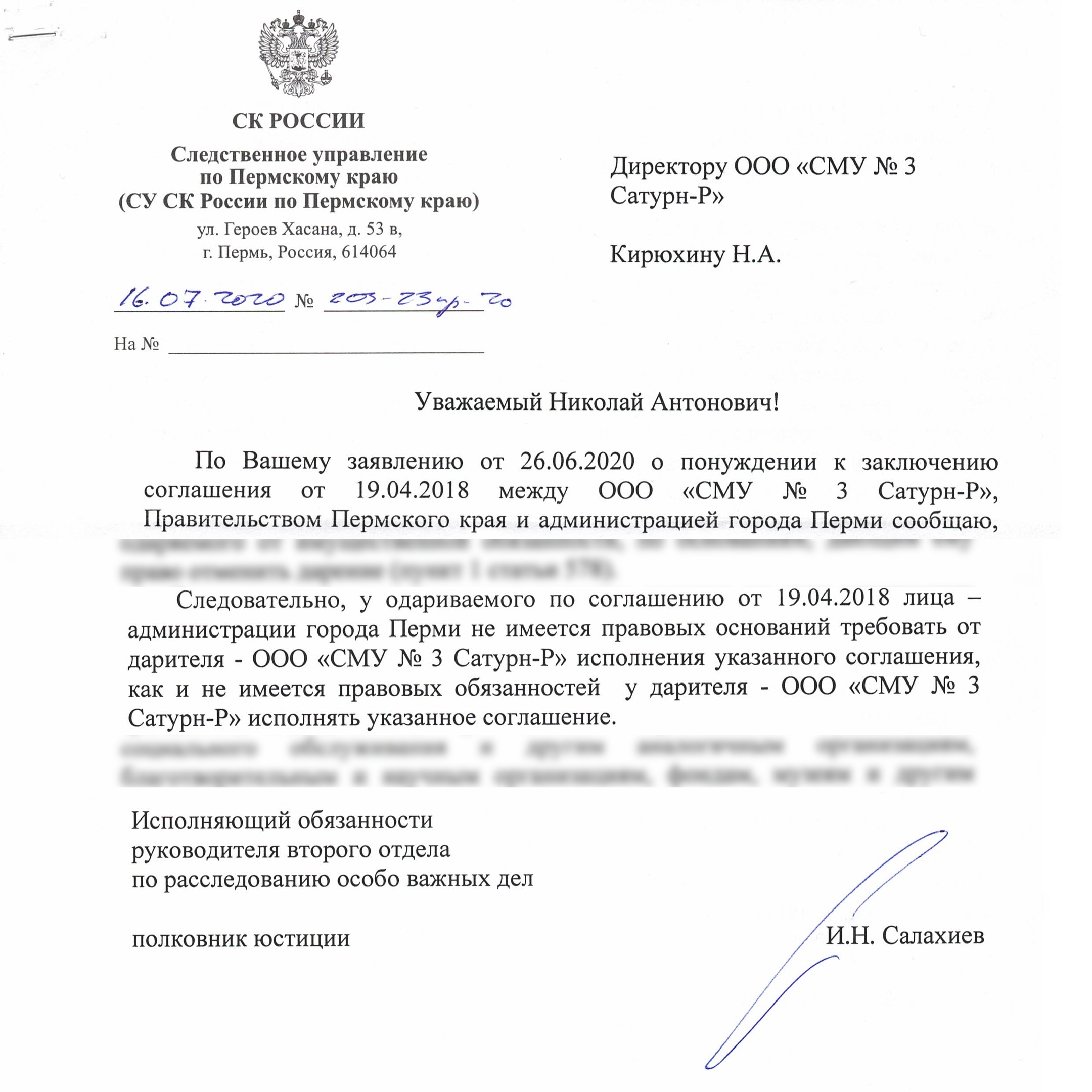 Владелец холдинга «Сатурн-Р» Александр Репин сообщил, что экс-гендиректор компании Николай Кирюхин получил ответ от СУ СК по Пермскому краю на заявление «о понуждении к заключению соглашения между ООО «СМУ №3 Сатурн-Р», правительством Пермского края и администрации города Перми». Это касается спорной школы, которую компания построила в микрорайоне Красные казармы.