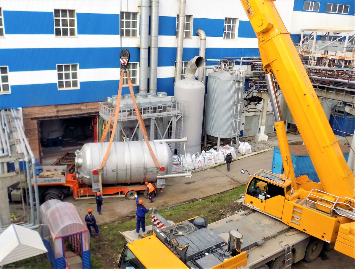 Технологическое оборудование уже поставлено к месту монтажа. Возведены фундаменты, идёт монтаж самих ёмкостей. В производственном корпусе построен бункер карбамида, уже установлен на своё место реактор. По графику комплектации поставляется вспомогательное оборудование — кабели, клапаны, КИП, арматура, ожидается поставка автоматической станции подачи карбамида.