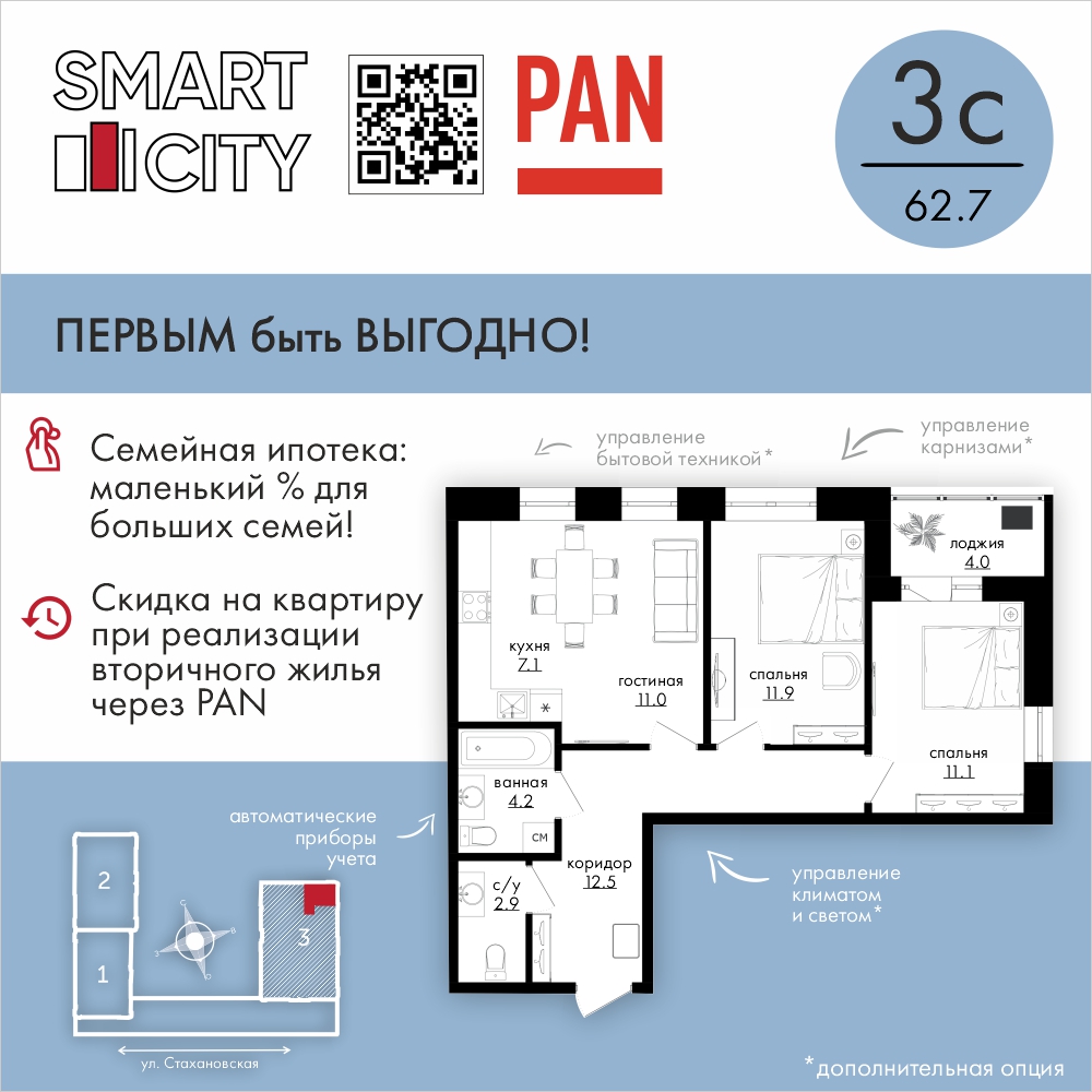 В уходящем году многие семьи уже решили свой квартирный вопрос с помощью государственных ипотечных программ. У вас большая семья, или вы только ждёте пополнения? Выгодным предложением для вас будет ипотека с господдержкой для семей, в которых с 1 января 2018 по 31 декабря 2022 года родится второй и/или последующий ребёнок. Так, при покупке трёхкомнатной квартиры-студии площадью 62,7 кв. м в ЖК SMART City в ипотеку на срок 25 лет с первоначальным взносом 15% ежемесячный платёж составит всего от 18 тыс. руб.4! Если программа «Семейная ипотека» не подойдёт вам по каким-либо причинам, менеджер отдела продаж PAN City Group поможет вам с одобрением ипотеки на выгодных условиях в другом банке5.