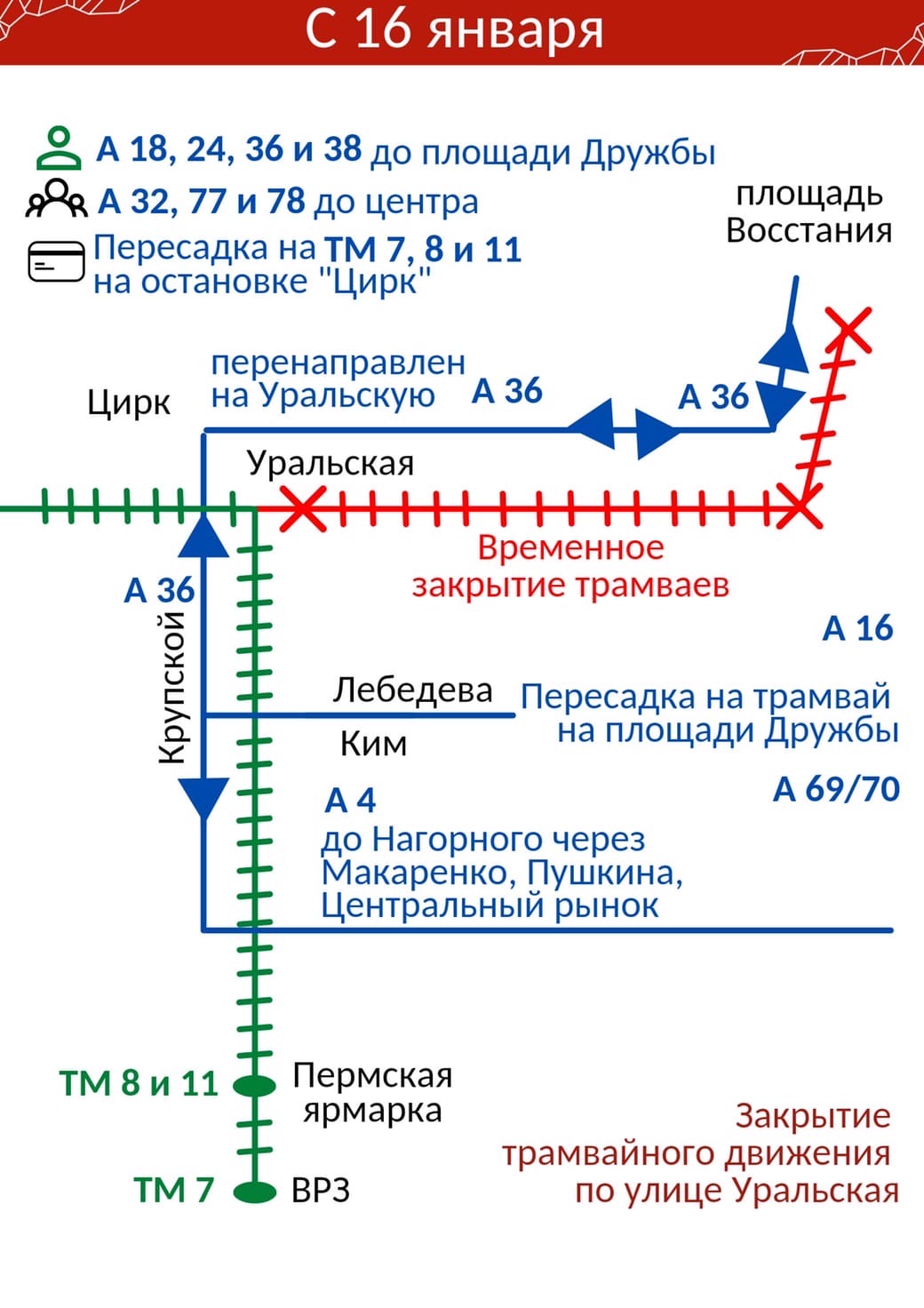Из-за этого трамвайные маршруты №8 и №11 будут следовать до остановки «Цирк», а далее по ул. Крупской и бульвару Гагарина до «Пермской ярмарки» и разворачиваться обратно.