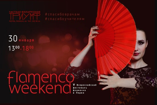 30 января в 13:00 частная филармония «Триумф» приглашает на V Всероссийский фестиваль искусства фламенко Flamenco-weekend (6+). Фестиваль объединяет танцоров и музыкантов фламенко из Перми, Екатеринбурга, Челябинска, Кирова, Ижевска, Москвы и Санкт-Петербурга. Специальными гостями фестиваля станут лучшие исполнители фламенко в России — Алексей Стародубцев и Светлана Рудник (Москва).