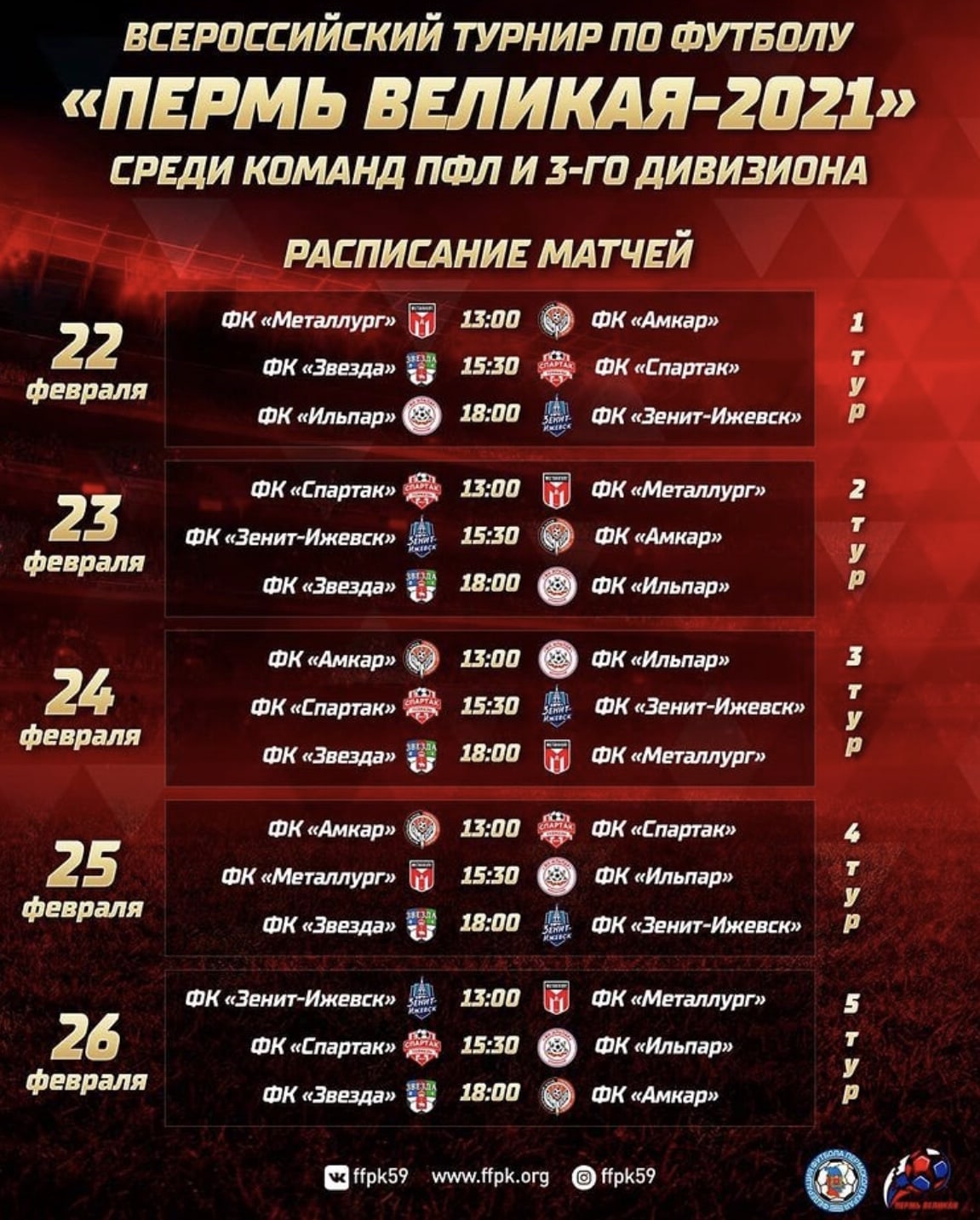 «Амкар», в свою очередь, 22 февраля начнёт выступление на турнире встречей с «Металлургом». 23 февраля «красно-чёрные» сыграют с «Зенитом-Ижевск», 24 февраля — с ильинским «Ильпаром». 25 февраля возрождённый клуб ждёт встреча со «Спартаком» из Туймазы.