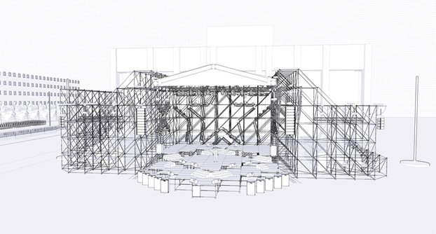 Как сказано в конкурсной документации, размеры сценического комплекса составят: ширина — 39,33 м, глубина — 20,70 м, высота — 12,4 м. Расположен он будет не менее чем на 10 м от нижней ступени Театра-Театра и установлен на площади перед театром строго по центру. Комплекс должен быть обеспечен световым оборудованием.
