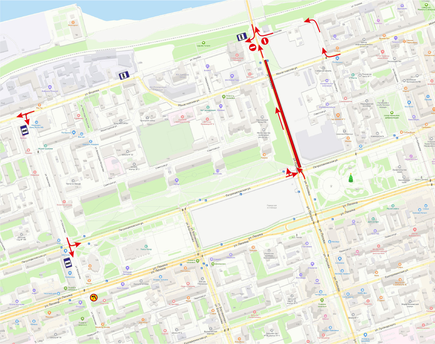 В этот же период временно закроют движение по ул. Монастырской на перекрёстке с Попова. Объезд закрытого перекрёстка организуют при движении на Коммунальный мост по улицам Осинской и Окулова, при движении к ул. Свердловской — по улицам Ленина, Крисанова, Монастырской и Окулова.