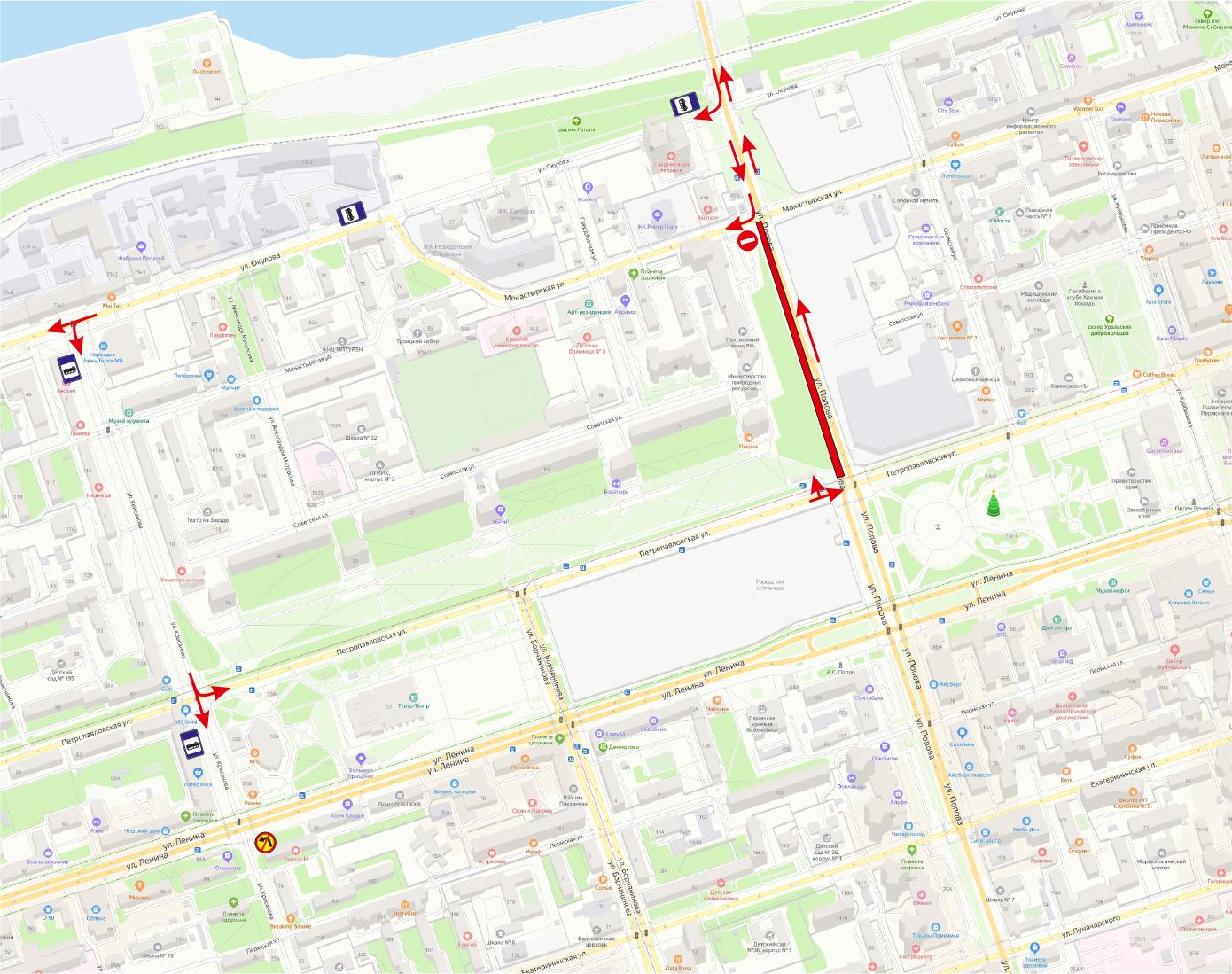 Для движения закроют две полосы по нечётной стороне ул. Попова. Транспорт по направлению от Коммунального моста к ул. Петропавловской пустят в объезд по улицам Окулова и Крисанова. Движение по Попова от ул. Петропавловской к Коммунальному мосту сохранится в полном объёме.