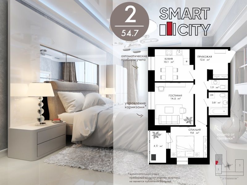 Хит продаж ЖК SMART City — двухкомнатные квартиры 54,7 кв. м. Вместительная прихожая с местом для шкафа-купе, две отдельные спальни — в такой квартире места хватит каждому члену семьи! Лоджия правильной формы может быть использована как гардеробная, лаунж-зона или рабочий кабинет, что позволит сэкономить дополнительные метры и создать необходимую функциональную зону.