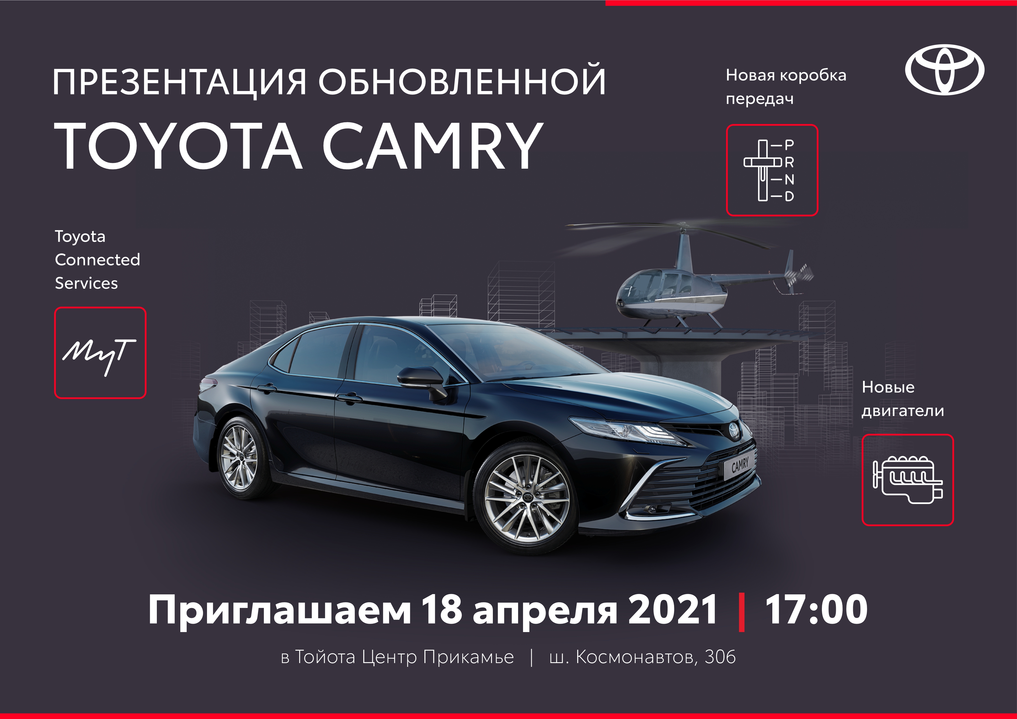 Всех желающих встретиться с обновлённой TOYOTA CAMRY ждут в воскресенье, 18 апреля, в 17:00 в автоцентре «Тойота Центр Прикамье» по адресу шоссе Космонавтов, 306.