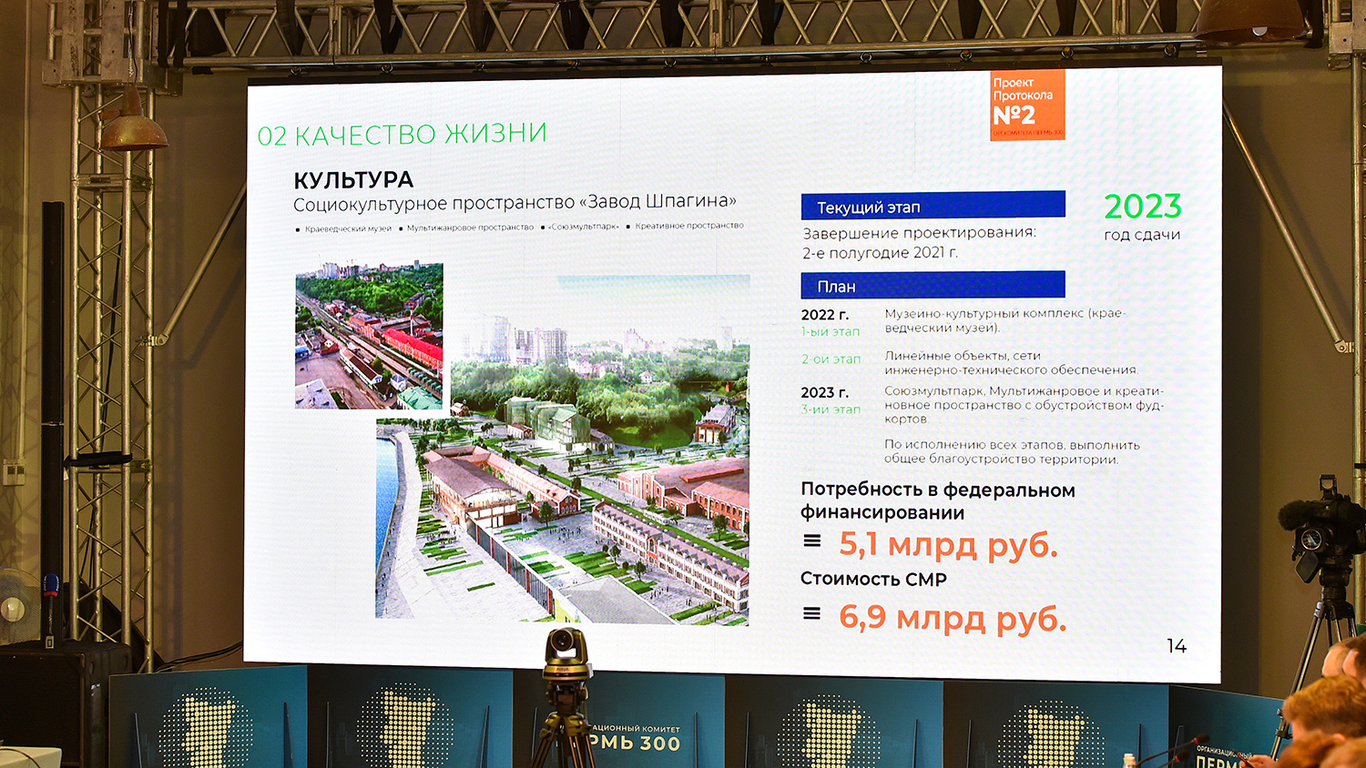 Одна из главных задач в рамках подготовки к 300-летию — формирование кластера на «Заводе им. Шпагина». Именно здесь разместится новое здание Пермской художественной галереи. На данный момент завершено проектирование, определён подрядчик (ООО «ЛимакМаращСтрой»), идёт подготовка строительной площадки. Стоимость строительно-монтажных работ — 5,2 млрд руб., потребность в федеральном финансировании — 3,9 млрд руб. Объект планируется завершить к 2023 году. На этом же пространстве разместится Музей пермских древностей, а также «Союзмультпарк» (в рамках соглашения с «Союзмультфильмом»).