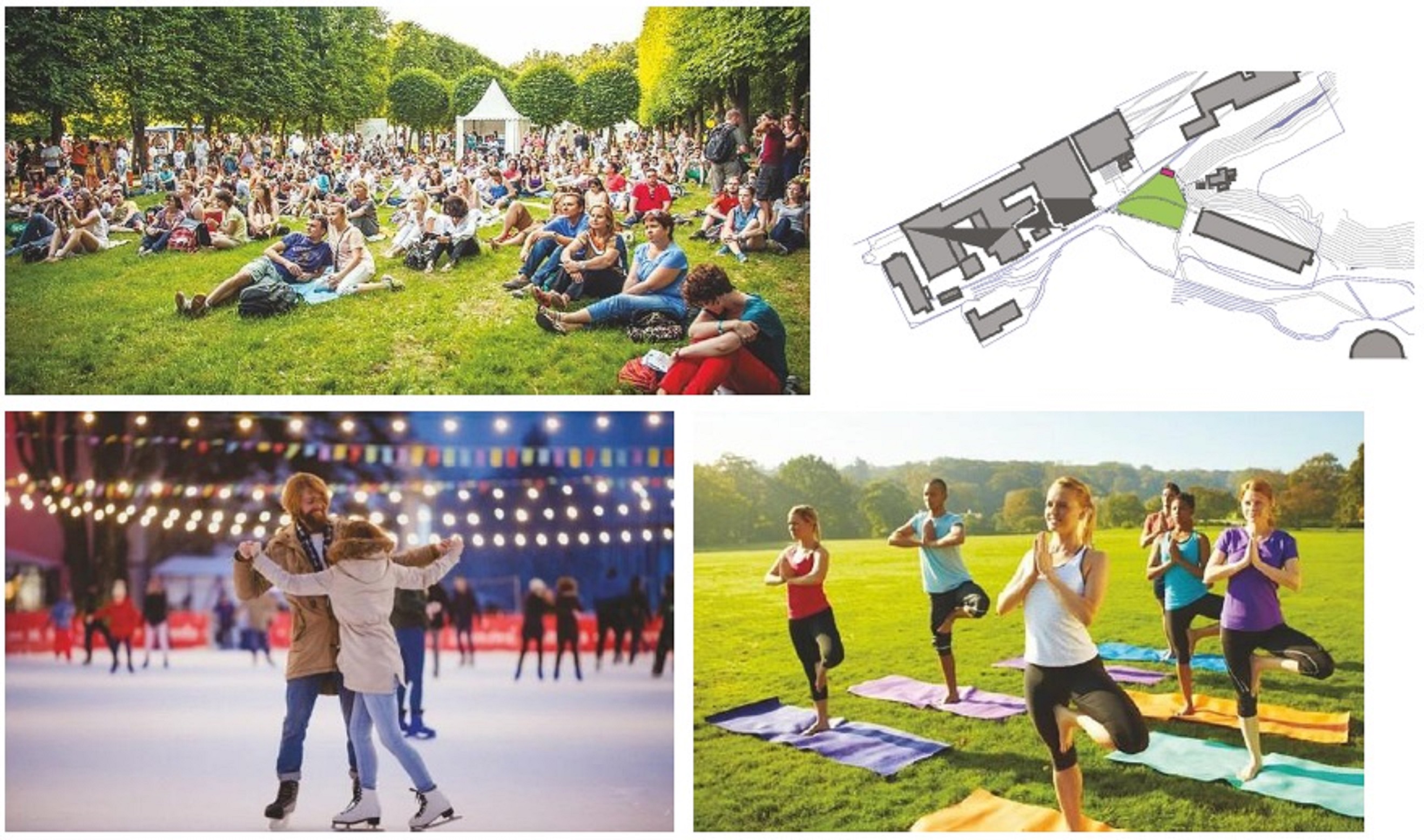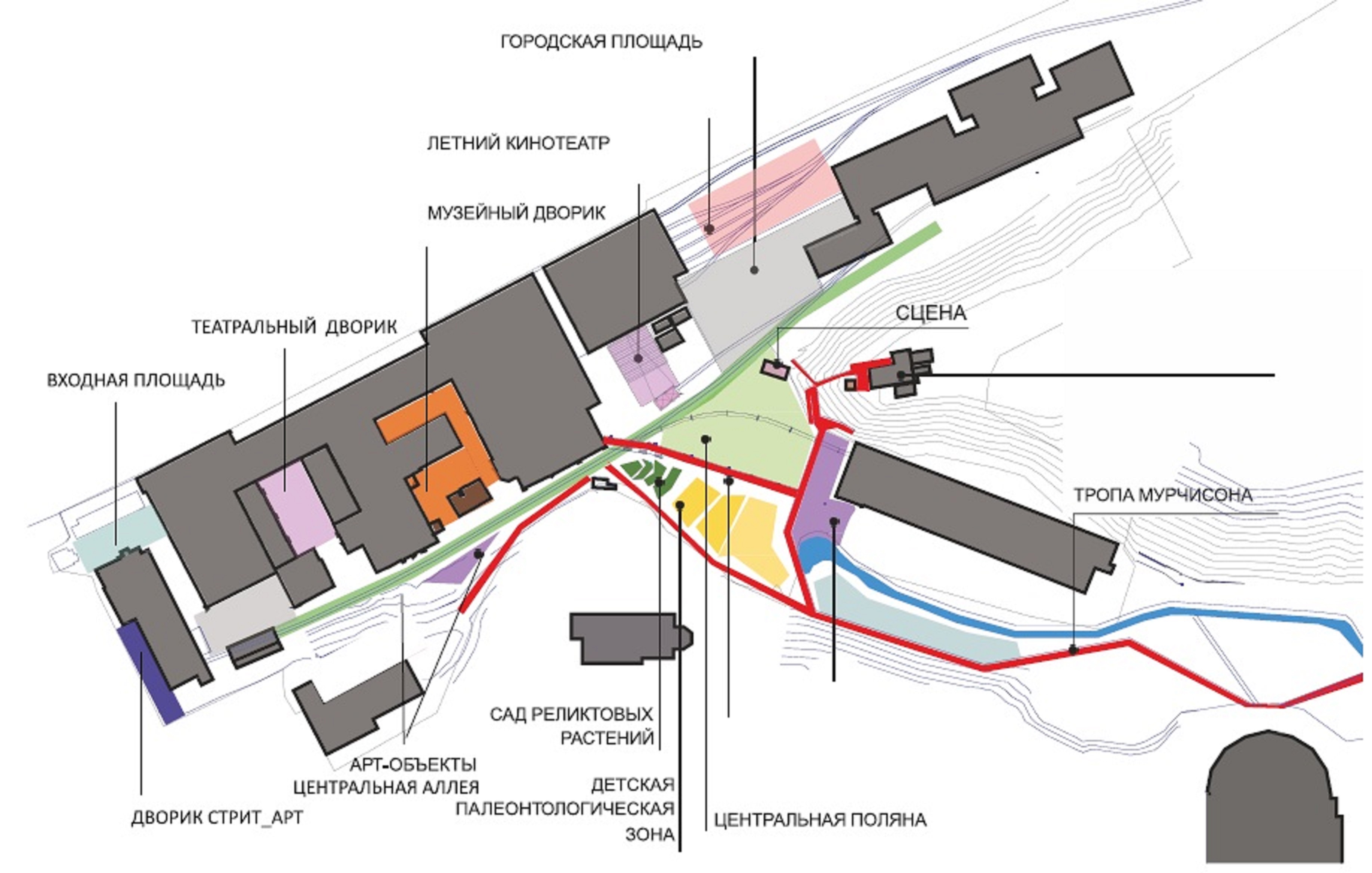 Кроме того, на территории кластера будут летний кинотеатр и летняя открытая сцена, театральный и музейный дворики, будет проложена и обустроена познавательная тропа Мурчисона. Между основным комплексом заводских зданий и «Литерой А» — новым цехом, построенным в 1990-е годы и находящимся поодаль от остальных, — расположится «центральная поляна», где в тёплое время года планируется проводить различные события формата open air — например, занятия йогой, а зимой — каток. Рядом с будущим зданием Пермской художественной галереи будет обустроена «городская площадь» в европейском стиле для проведения ярмарок.