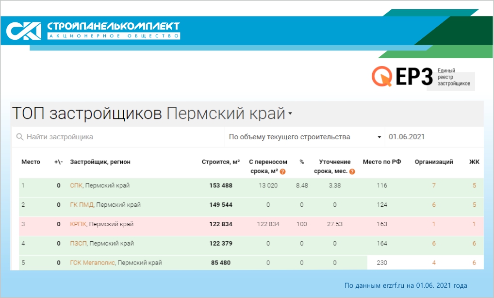 *По состоянию на 01.06.2021 по данным Единого ресурса застройщиков erzrf.ru