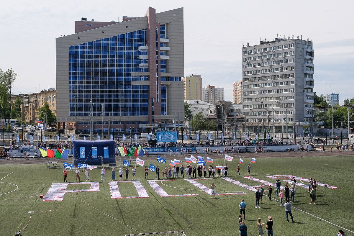 На футбольном поле участники пробега выложили из 600 флагов страны большую надпись «РОССИЯ» — в знак признания в любви большой стране, в которой мы живём.