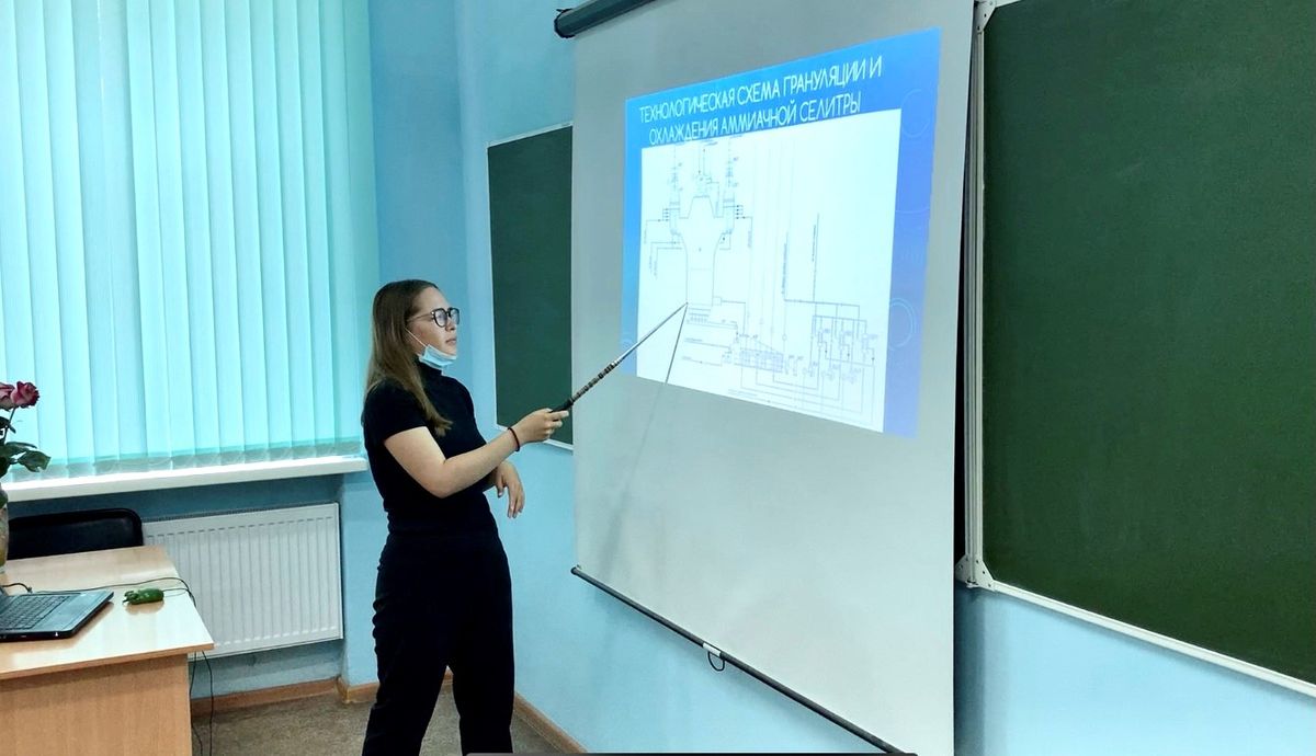 Александр Колобов, заместитель начальника цеха крепкой азотной кислоты филиала «Азот» по технологии, принимал экзамен по основному направлению подготовки специалистов — модуль «Эксплуатация и обслуживание технологического оборудования». Студенты техникума прошли курс обучения. Для экзамена они подготовили презентации.