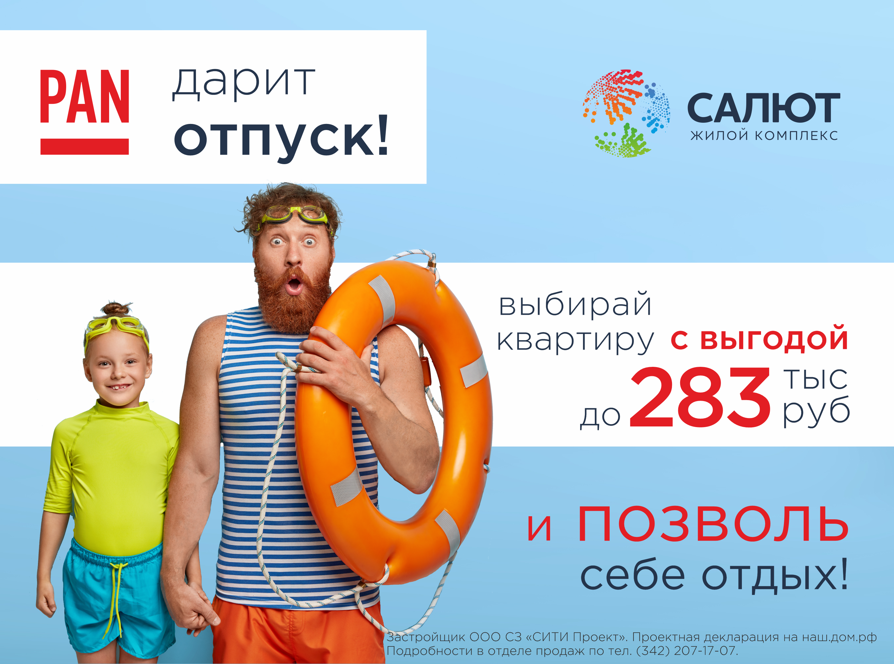 Отдых и покупка квартиры раньше казались несовместимыми событиями, но PAN City Group разрушает стереотипы, объявляя акцию на квартиры в жилом комплексе «Салют»1 (ул. Камская, 2/4). Только в августе Вы можете сэкономить, купив квартиру со скидкой до 283 тыс. руб., и поехать в отпуск всей семьёй! Теперь не нужно выбирать — новая квартира или долгожданный отдых. С организатором акции PAN City Group2 возможно всё!