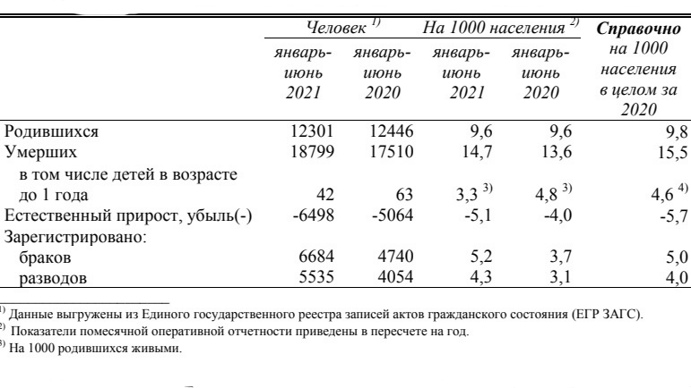 Общие тенденции депопуляции населения определяет ситуация с высокой смертностью людей трудоспособного возраста. Среди всех умерших за январь — июнь 2021 года лица трудоспособных возрастов составили 23,9%, или 4486 человек, из которых более трёх четвертей составили мужчины (77,4%).