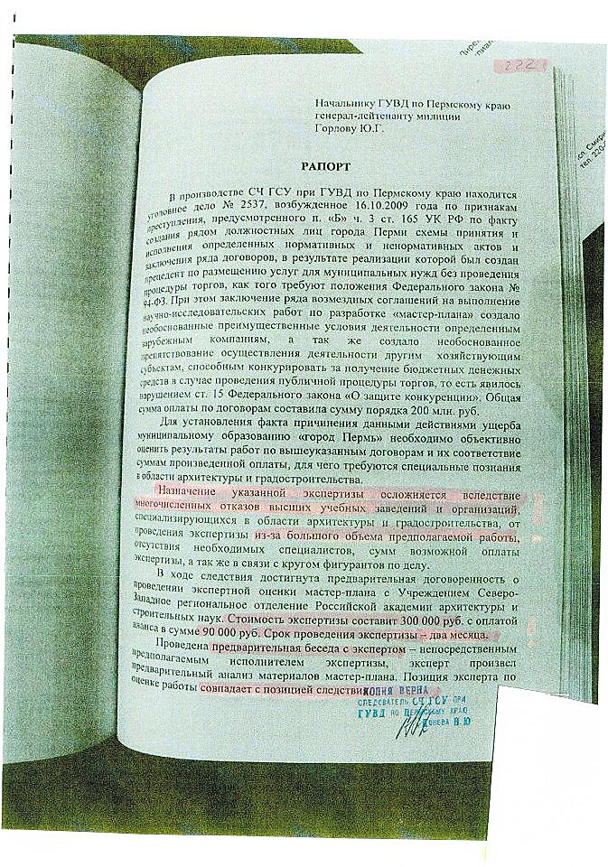 В рапорте значится, что уголовное дело возбуждено 16 октября 2009 года, а сам он направлен начальнику ГУВД по Пермскому краю Юрию Горлову. Согласно документу, «заключения ряда возмездных соглашений на выполнение научно-исследовательских работ по разработке «мастер-плана» создало необоснованные преимущественные условия деятельности определённым зарубежным компаниям, а также создало необоснованное препятствование осуществления деятельности другим хозяйствующим субъектам, способным конкурировать за получение бюджетных денежных средств в случае проведения публичной процедуры торгов».