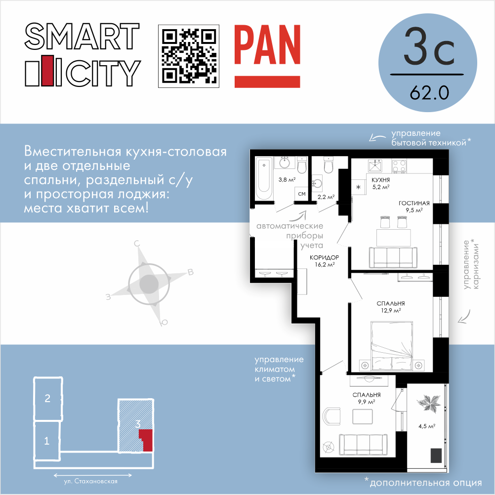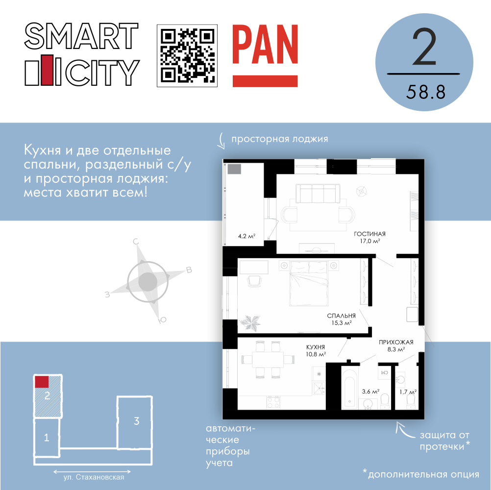 1. Местоположение. Локацию ЖК SMART City на ул. Стахановской, 52а выбирают люди, дорого ценящие своё время и комфорт. Дом расположен в тихом месте, но вместе с тем вблизи одной из центральных транспортных развязок нашего города. Отсюда можно быстро добраться в любой район: в центр города (4 км), парк для прогулок и активного отдыха (1,5 км) или аэропорт (17 км).