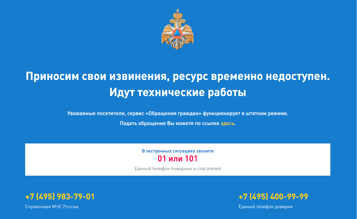 «Приносим свои извинения, ресурс временно недоступен. Идут технические работы. Сервис «Обращение граждан» работает в штатном режиме», — написано на сайте ГУ МЧС Прикамья.