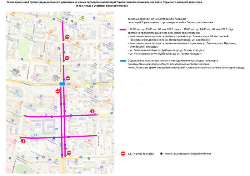 В Перми из-за репетиции Парада Победы 5 мая с 19:00 до 23:00 и 7 мая с 10:00 до 14:00 будет закрыто движение для автомобилей, а также изменится ряд маршрутов общественного транспорта. Об этом напомнили в пресс-службе мэрии.