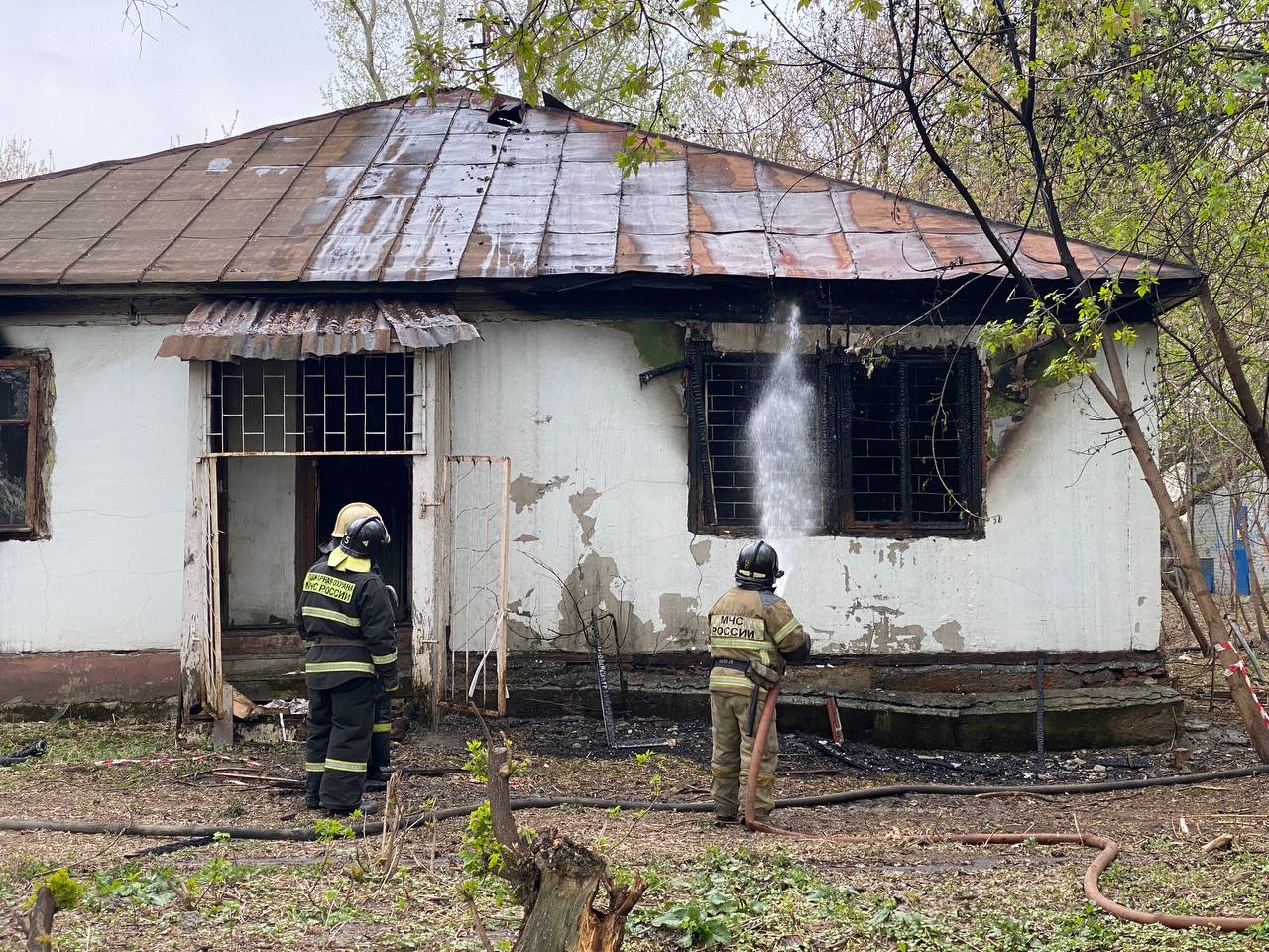 Пожар произошёл в одноэтажном хозяйственном корпусе со стороны ул. Пушкина, на месте работают пожарные.