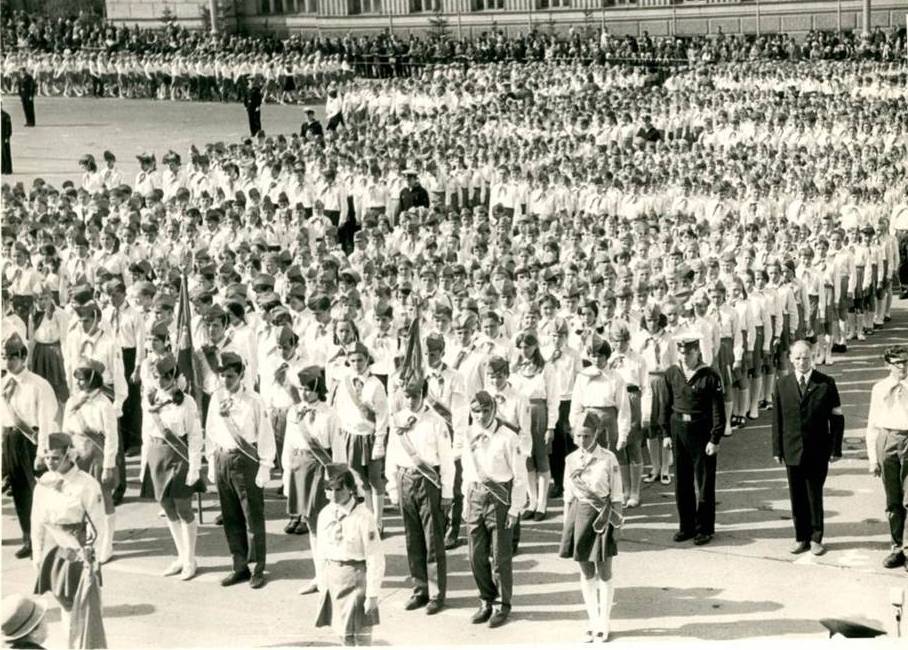 В том параде принимало участие 11 тыс. детей. Нынешняя церемония была не столь многолюдной, хотя недостатка в зрителях не было. Среди прочих на террасе Дома Мешкова присутствовали и дети в красных галстуках и пилотках, которыми предводительствовала депутат Законодательного собрания от КПРФ Анна Баранова.