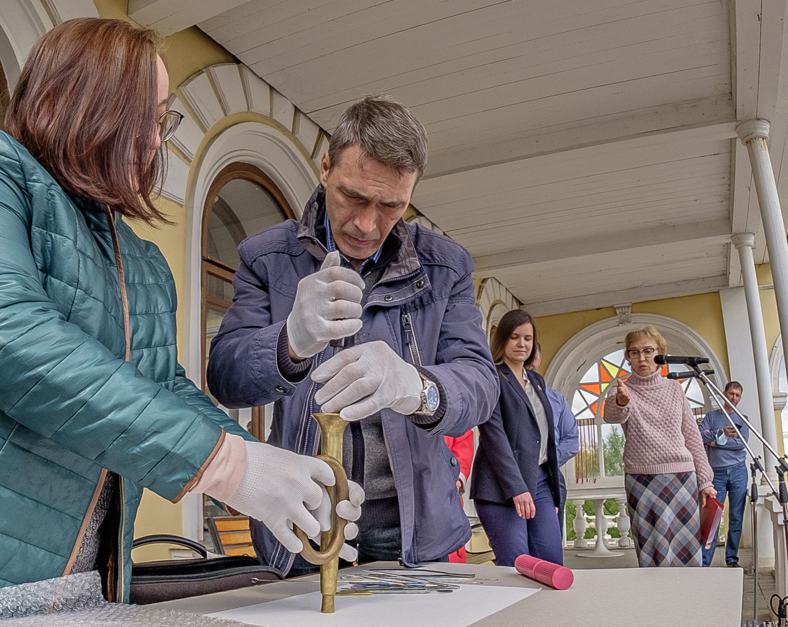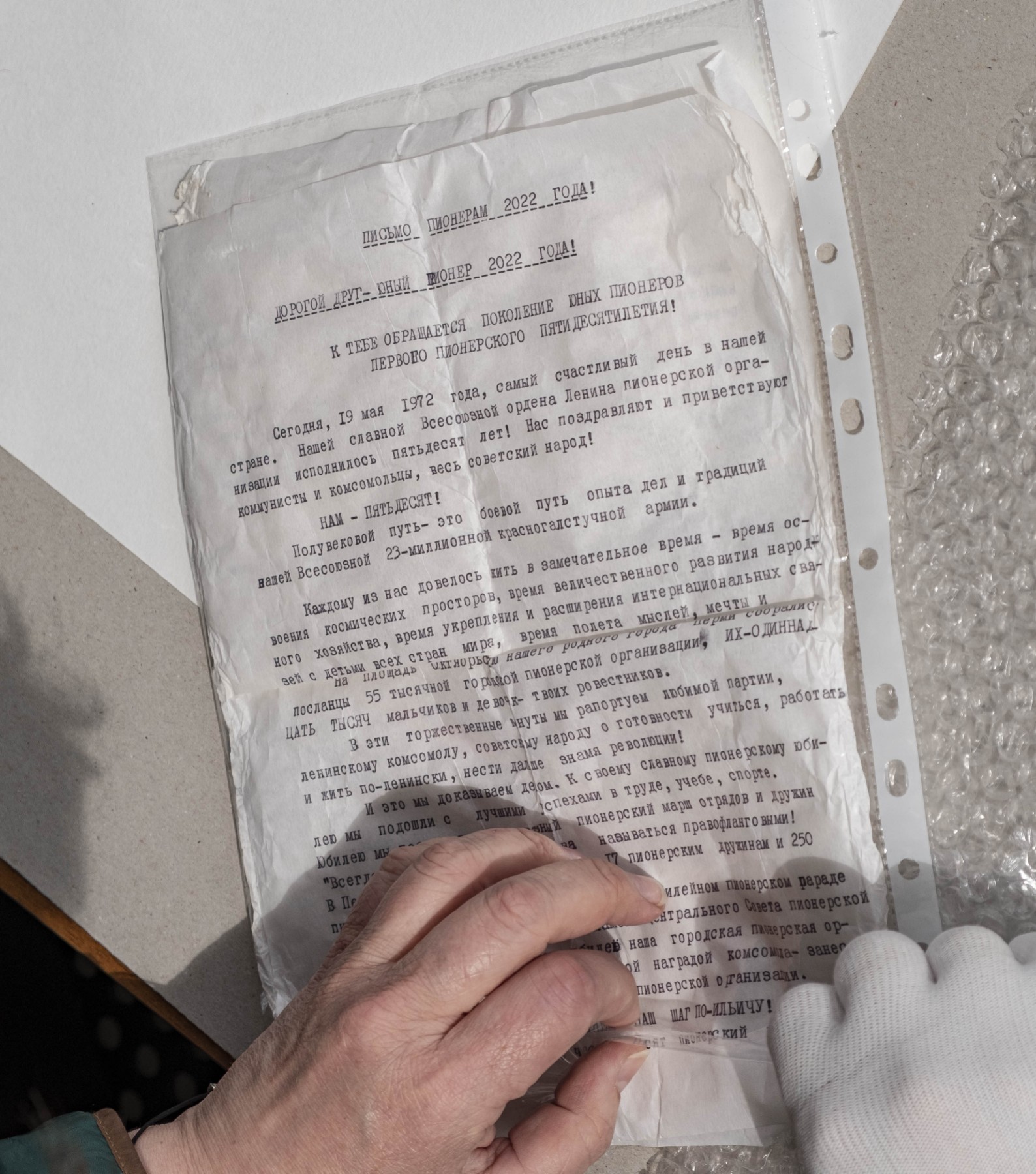 «Капсулу времени» в форме пионерского горна вскрывали по всем правилам музейного дела: в белых перчатках, с пинцетами. Текст послания из прошлого зачитала Анна Баранова:
