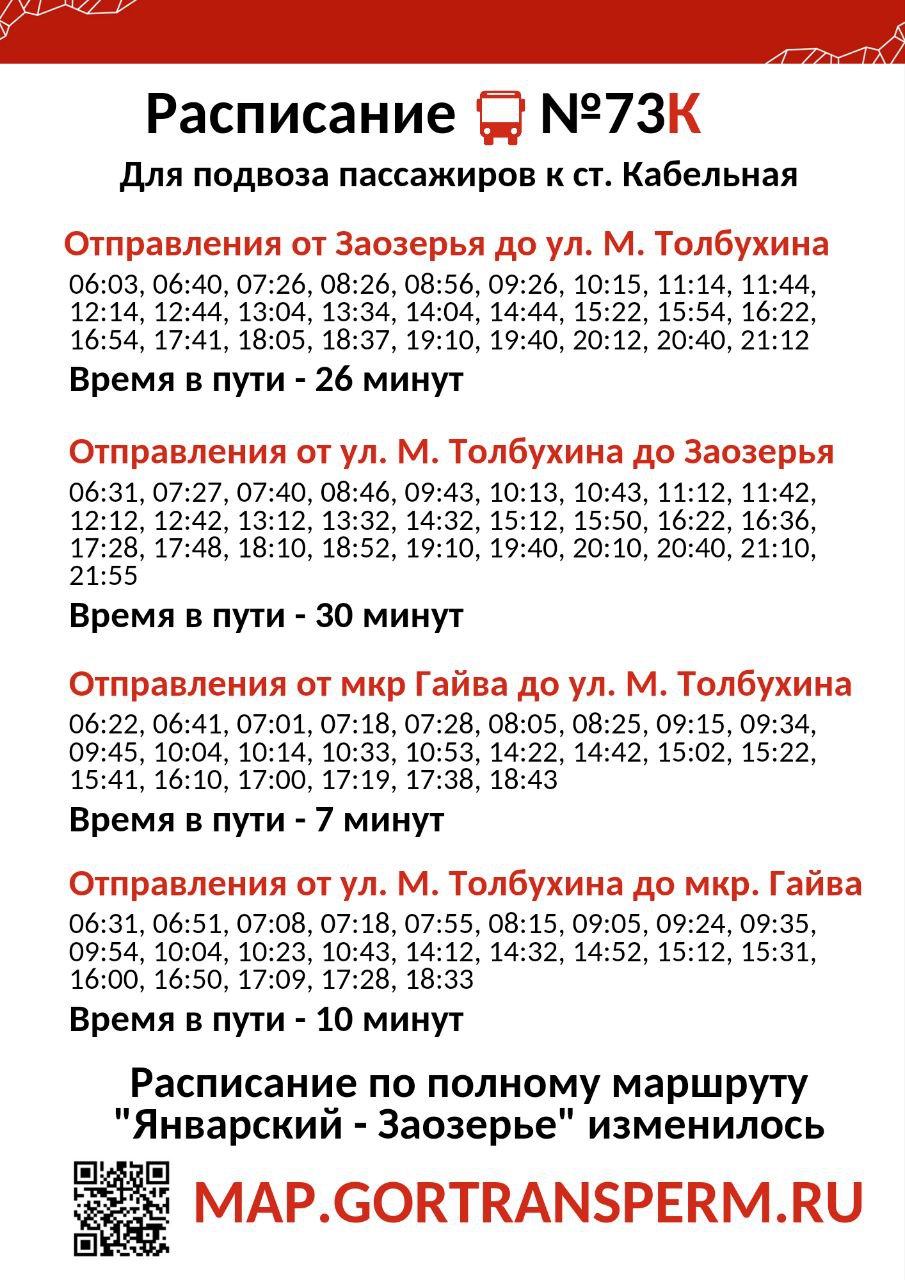 Сообщается, что у автобусов №73 появятся отдельные рейсы, которые будут обозначаться литерой «К». Они будут заниматься подвозом пассажиров к станции «Кабельная».