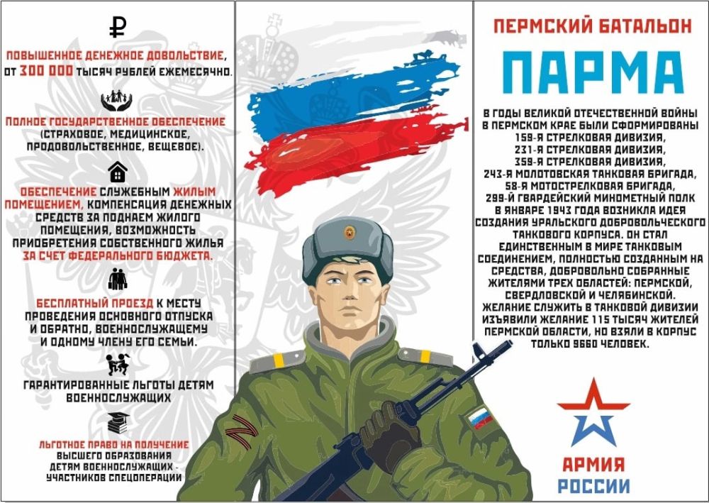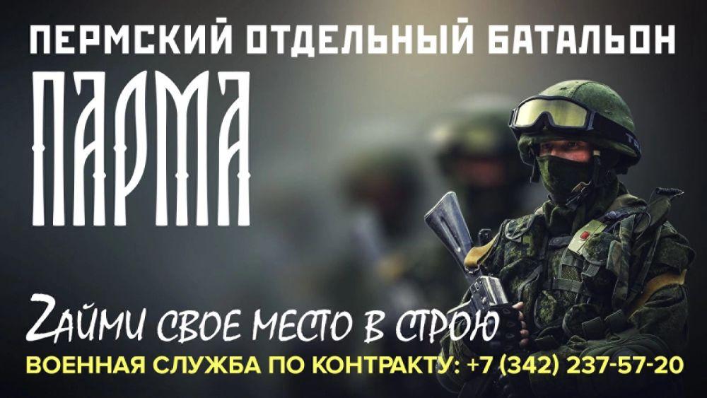 Для записи в батальон нужно прийти в отделение Пермского краевого военкомата по месту регистрации и заявить о своём желании. О сроках и условиях контракта обратившимся расскажут на месте. В частности, уже известно, что контрактникам будет выплачиваться зарплата от 300 тыс. руб. в месяц и обещано полное государственное обеспечение.