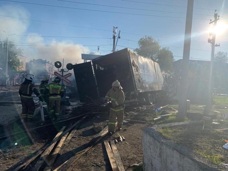 Напротив дома № 95а по ул. Попова у грузовика лопнуло правое переднее колесо, в результате водитель большегруза потерял управление, допустил столкновение с пятью автомобилями, стоящими перед закрытым железнодорожным переездом, а также въехал в охранный пост дежурного по переезду и движущийся железнодорожный состав.