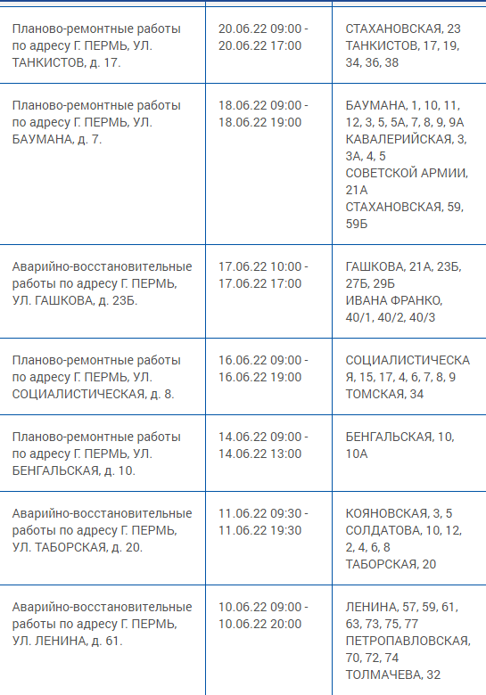 В компании «Новогор-Прикамье» опубликовали график отключения воды с 10 по 20 июня. До конца второй декады месяца из-за плановых и аварийных работ холодное водоснабжение будет отключаться в 50 многоквартирных домах Перми.