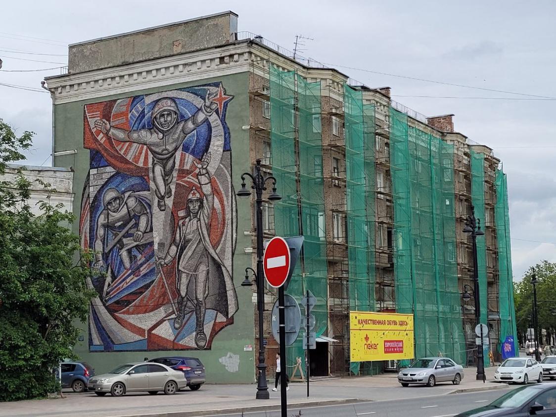 Подрядчик заменит старый слой штукатурки, покрасит фасад, восстановит архитектурные элементы: лепнину, гирлянды и вензеля вдоль всей горизонтали здания. При этом предполагается полное сохранение узнаваемого мозаичного панно «Комсомол в решающие моменты истории».