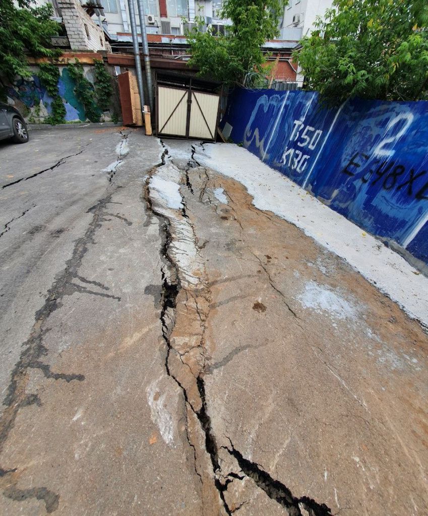 На кадрах отчётливо виден и треснувший асфальт, и покосившийся в сторону котлована забор.