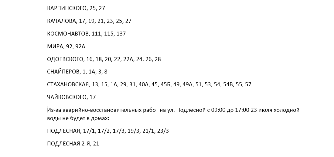 В частности, в связи с проведением аварийно-восстановительных работ по ул. Стахановской, 45 с 17:00 22 июля по 17:00 23 июля отключат холодную воду по следующим адресам: